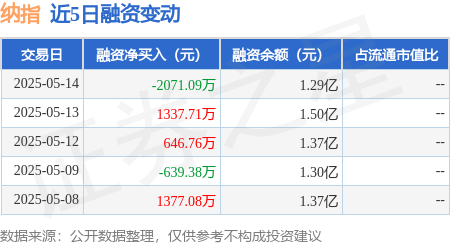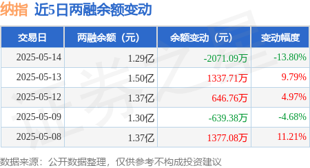 本站消息,5月14日,纳指(159659)融资买入7709.34万元,融资偿还9780.43万元,融资净卖出2071.09万元,融资余额1.29亿元。